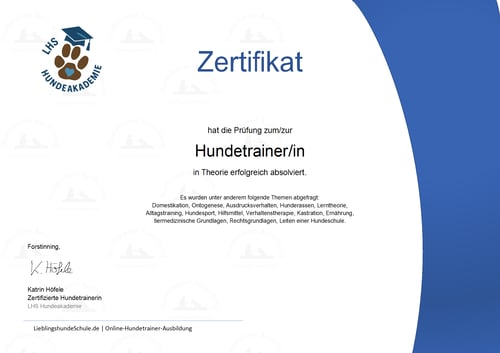 Wir bieten zudem eine separate, freiwillige Prüfung an, bei deren Bestehen das Zertifikat "Hundetrainer" ausgestellt wird. Diese kann jederzeit separat gebucht werden und ist nicht Teil des Onlinekurses.