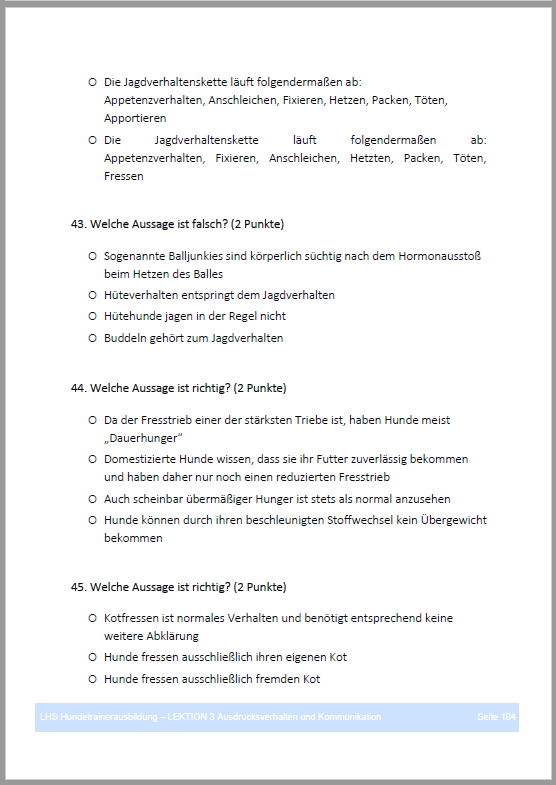 wirklich sehr ähnlich die bei der 11er-Prüfung geforderten Antworten. Das Ergebnis der Hausaufgaben wird immer sofort angezeigt, so dass keine Fragen offen geblieben sind. Alles in allem ein sehr gelungener Kurs, um Hundetrainer zu werden.”