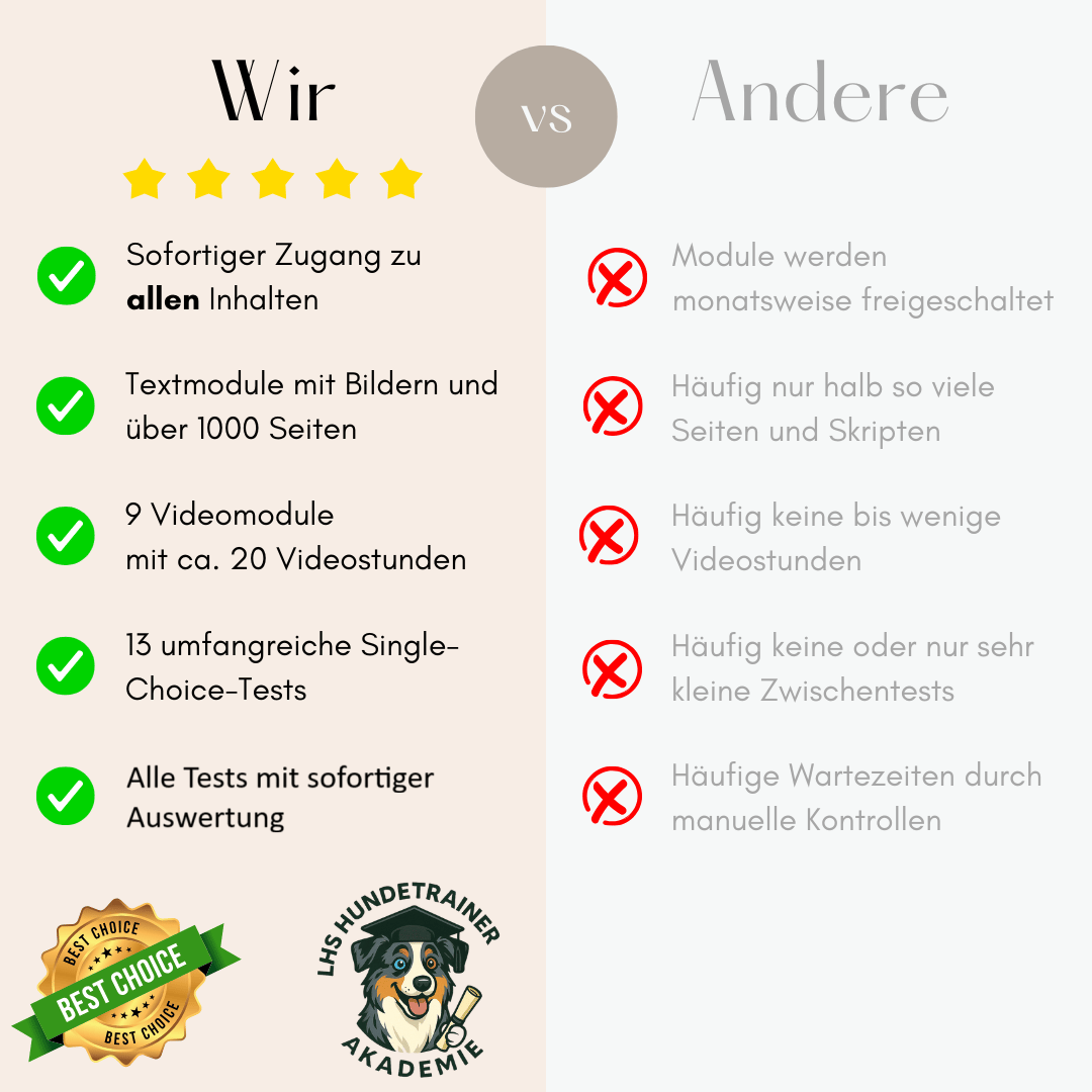 Unsere Ausbildung hebt sich stark von anderen Anbietern ab, da du jederzeit sofort und ohne Wartezeit starten kannst, sowie nach deiner Freischaltung direkt Zugriff auf sämtliche Inhalte der Hundetrainer-Ausbildung hast, ohne monatlich darauf warten zu müssen. So kannst du dein Lerntempo wirklich komplett selbst bestimmen und hast 12 Monate Zeit, die Ausbildung zu absolvieren. Die Ausbildungsdauer ist beliebig oft und auch nach Ablauf des Zugangs jederzeit verlängerbar*, dein Fortschritt geht dabei nicht verloren. Alle schriftlichen Medien sind zudem downloadbar und somit lebenslang für dich zugänglich. 😊